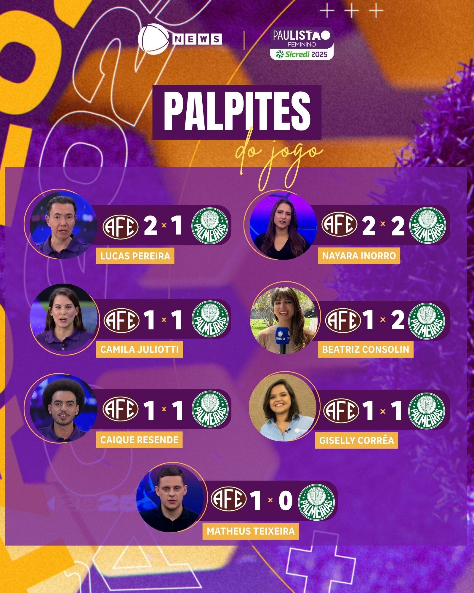 Na lista dos que apontaram o placar de 1 a 1 estão as comentaristas Camila Juliotti e Giselly Corrêa, além do apresentador do Esporte Record News, Caique Resende. Já Nayara Inorro, também palpitou no placar igual, só que com mais gols: 2 a 2.