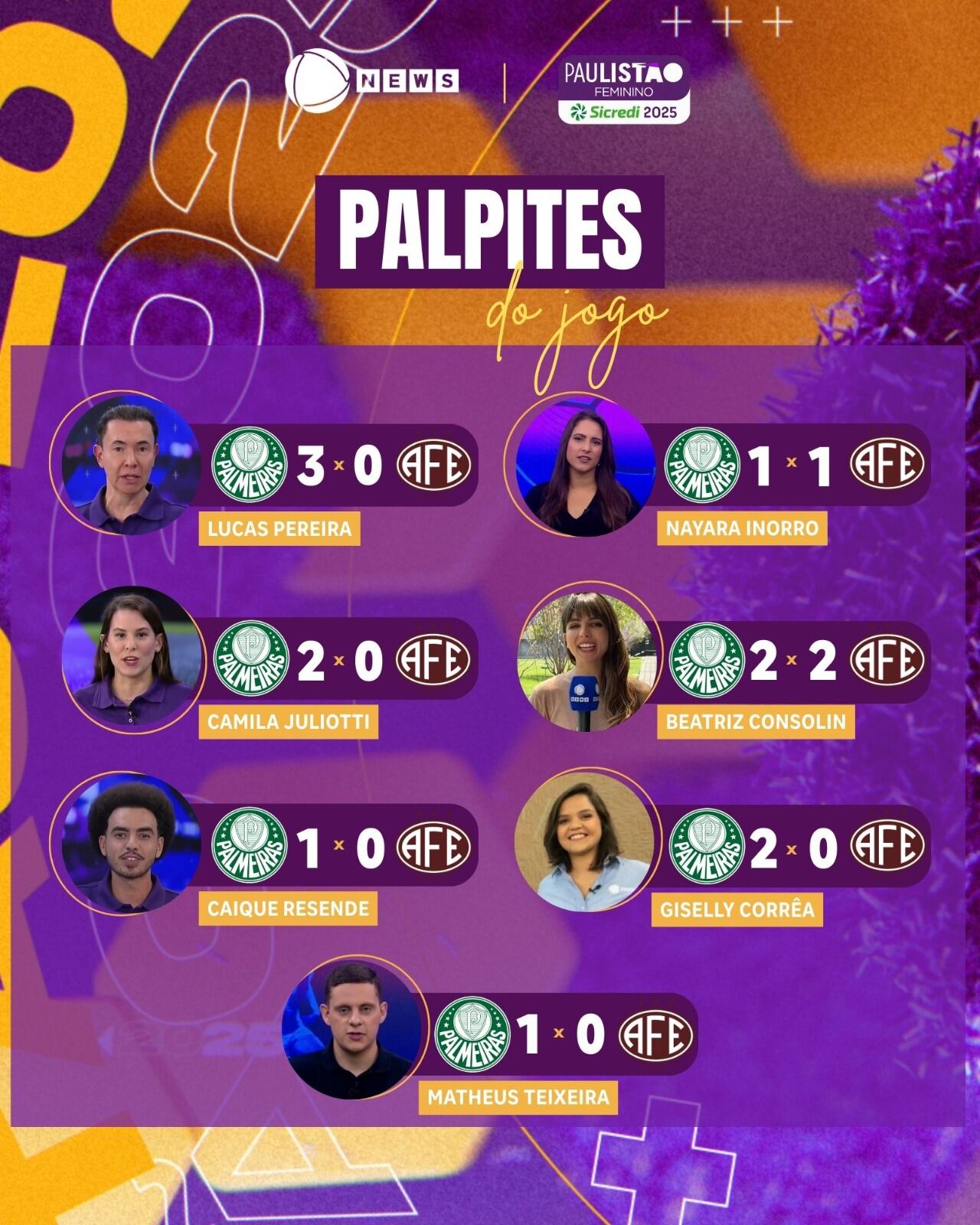 O narrador Lucas Pereira aposta na vitória do Palmeiras por 3 a 0. As comentaristas Camila Juliotti e Giselly Corrêa palpitaram que o time alviverde vai repetir o placar de 2 a 0 do jogo de ida.