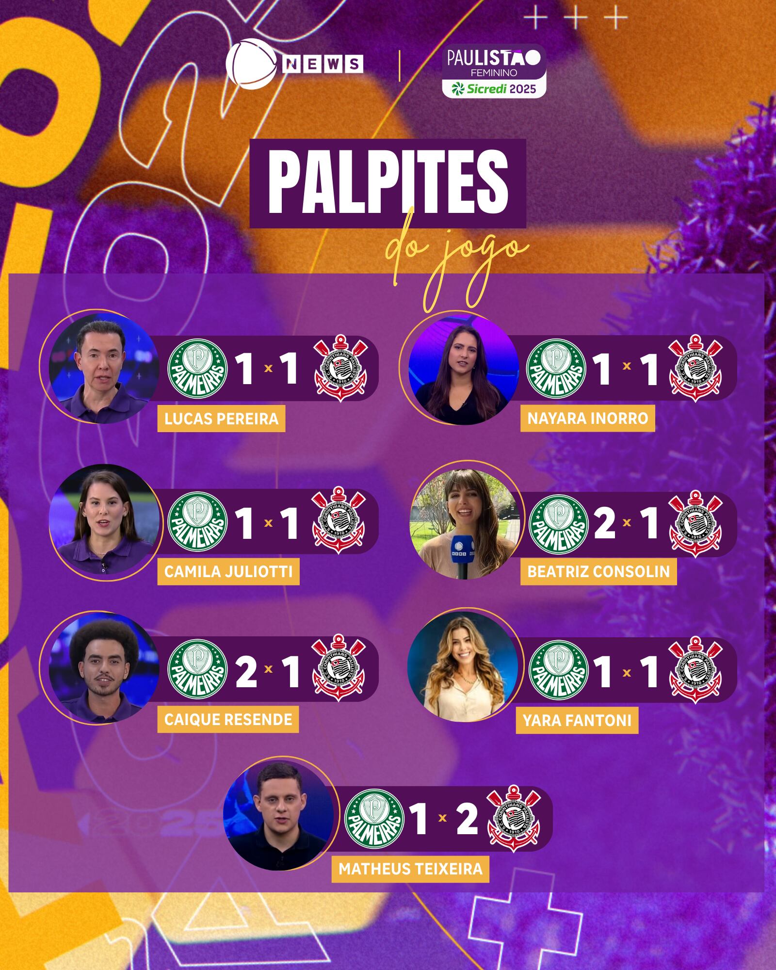 O narrador Lucas Pereira e a apresentadora do Elas com a Bola, Nayara Inorro, palpitam que o placar será 1 a 1. A comentarista Camila Juliotti e a comentarista convidada Yara Fantoni também acreditam que cada equipe paulista marcará um gol.