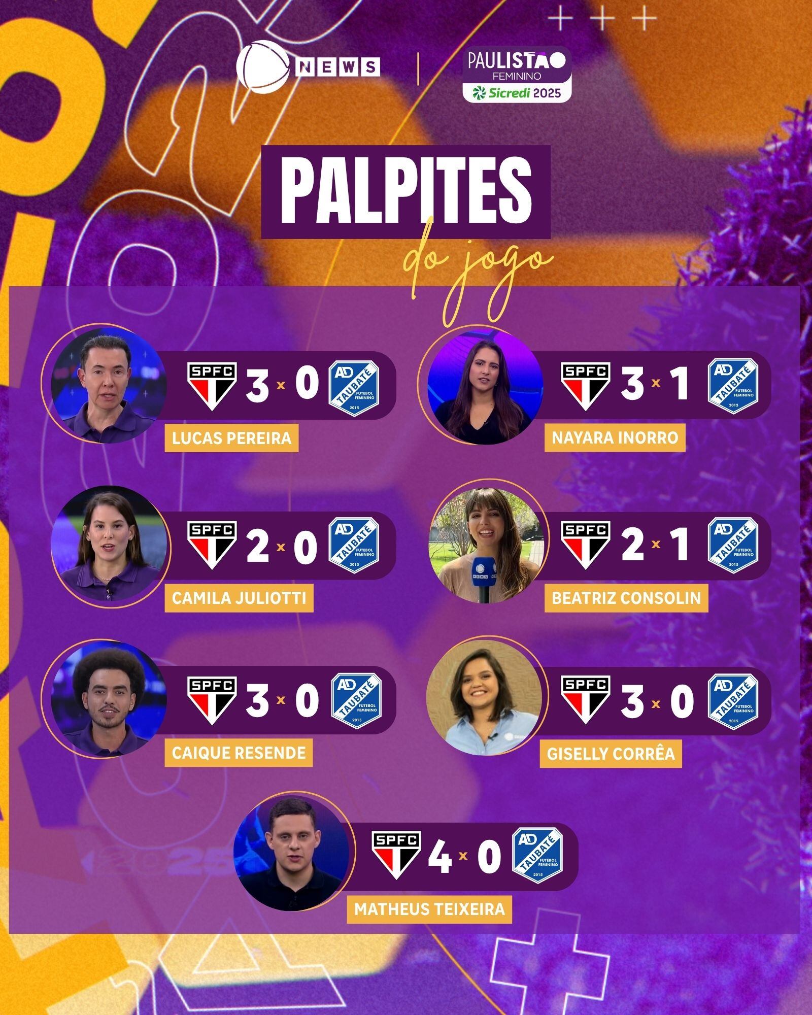 Nayara Inorro, do Elas com a Bola, também acredita que as Soberanas balançarão a rede três vezes, mas apostou em um gol de honra da equipe taubateense. Já Matheus Teixeira, parceiro de estúdio da apresentadora, chuta um placar ainda mais elástico, de 4 a 0 para o tricolor.