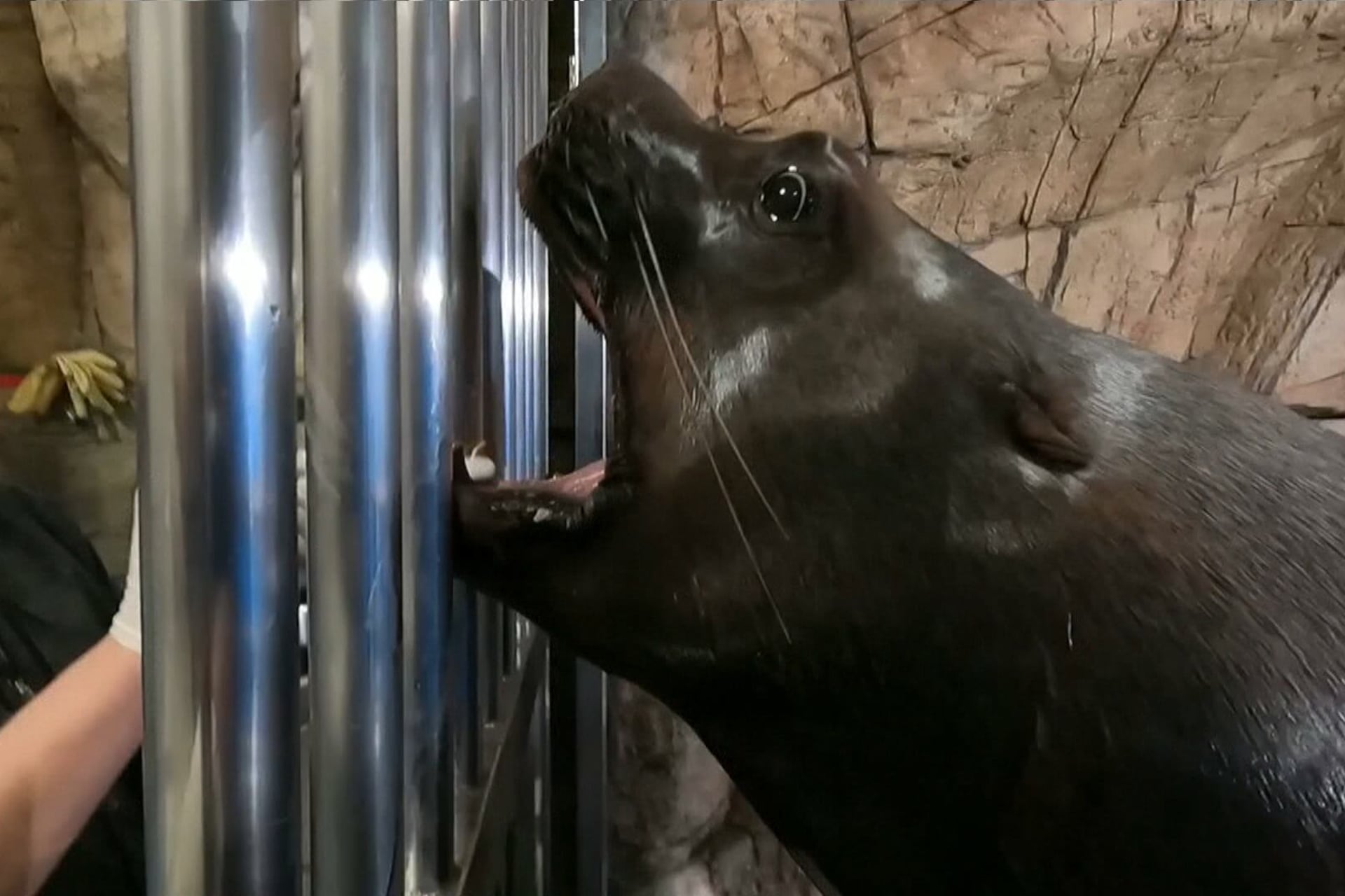 Leão-marinho se aproxima dos cuidadores com a boca aberta sempre que vê a escova