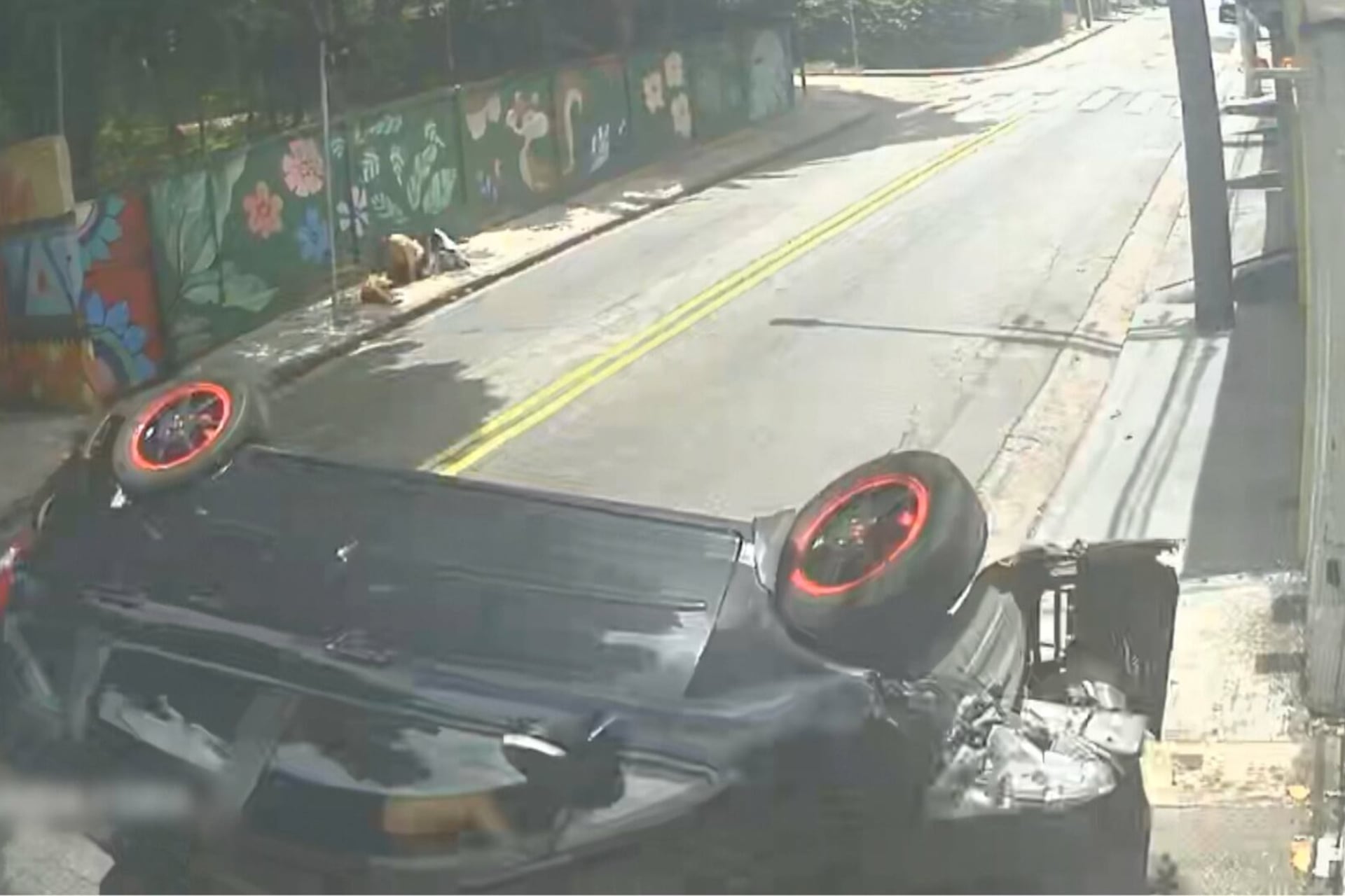 Veículo invadiu calçada e capotou; não foi informado estado de saúde das vítimas