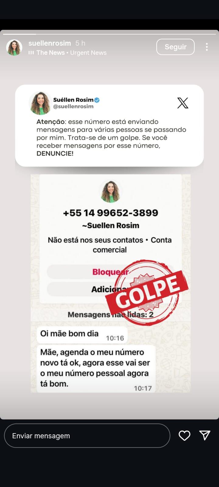 Ela publicou um print de uma conversa de um número (14) 99652-3899 chamando a mãe dela, Lúcia Rosim.