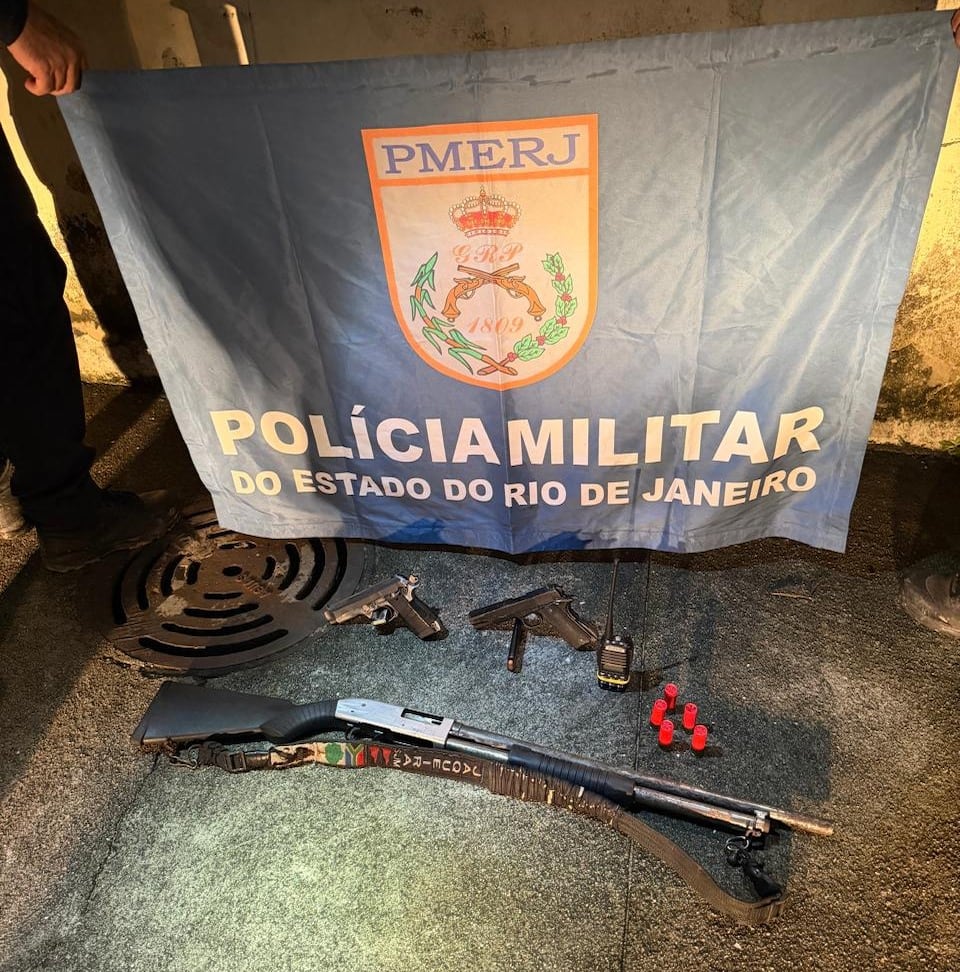 Com o grupo, os policiais apreenderam duas pistolas, uma espingarda calibre 12 e um rádio transmissor.