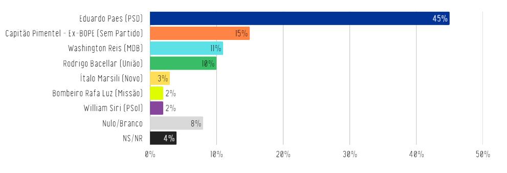 No quarto cenário, Paes registra 45%, enquanto Rodrigo Pimentel (sem partido), ex-capitão do Bope (Batalhão de Operações Policiais Especiais), aparece com 15%. Washington Reis tem 11%, Bacellar soma 10%, Ítalo Marsili aparece com 3%, e Rafa Luz e William Siri ficam com 2% cada.