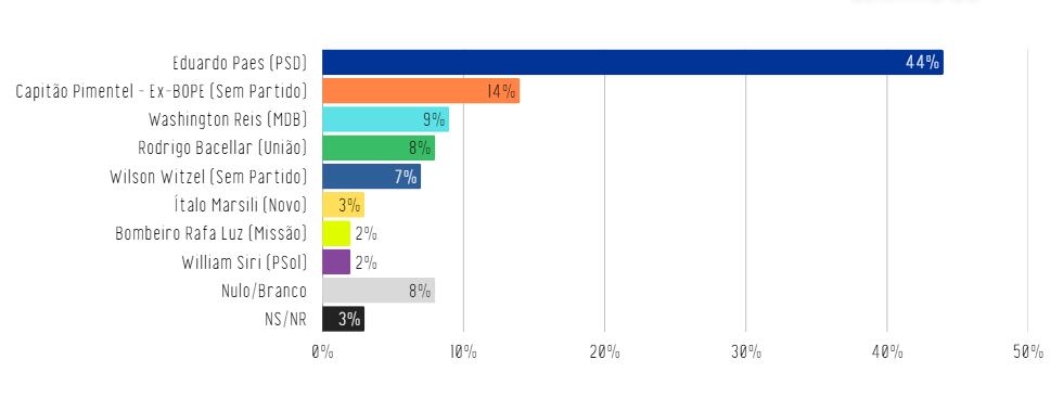 No primeiro cenário, Eduardo Paes (PSD) aparece disparado na frente, com 55% das intenções de voto. Rodrigo Bacellar (União Brasil), atual presidente da Alerj (Assembleia Legislativa do Estado do Rio de Janeiro), surge com 14%. Em seguida, o bombeiro e ex-policial militar Rafa Luz (Missão) e o médico Ítalo Marsili (Novo) empatam com 4% cada, enquanto o vereador William Siri (PSOL) registra 2%.