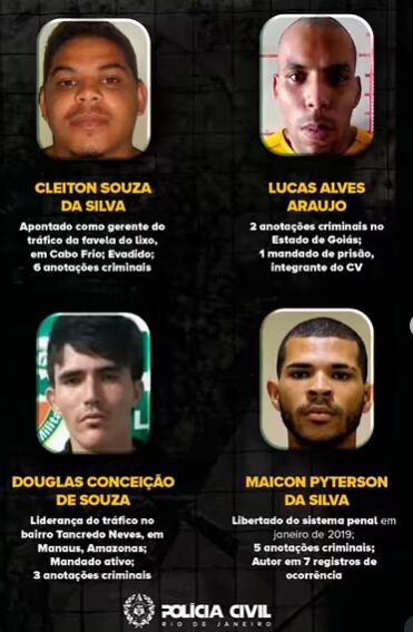 Os nomes e fotos dos suspeitos foram divulgados pela polícia. Segundo as investigações, 95% dos mortos tinham ligação comprovada com o Comando Vermelho e 54% eram de outros estados, incluindo chefes do grupo no Pará, Amazonas, Goiás, Maranhão e Espírito Santo.