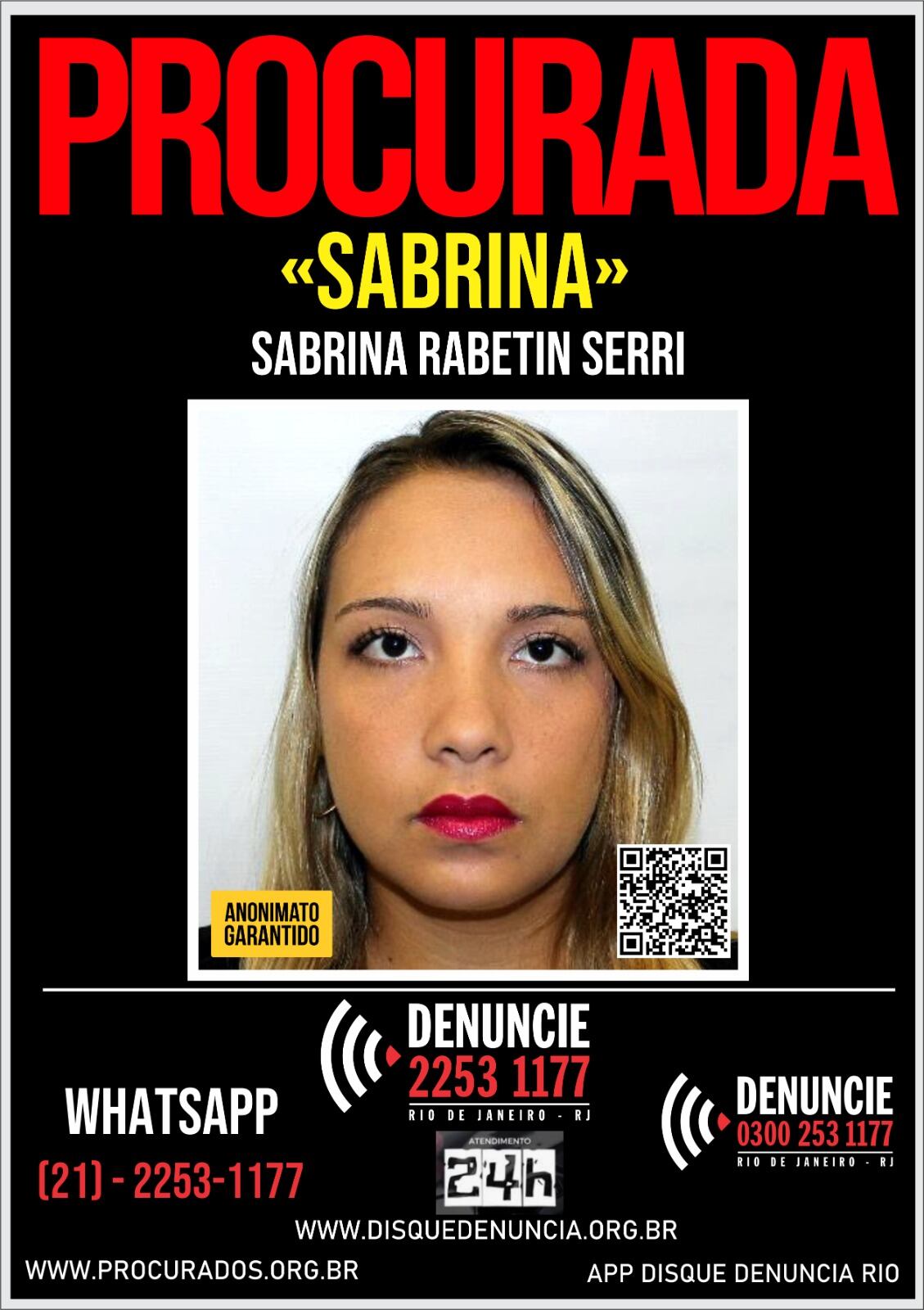 Quem tiver informações sobre a localização de Sabrina Rabetin pode entra em contato com o Disque Denúncia pelos seguintes canais: