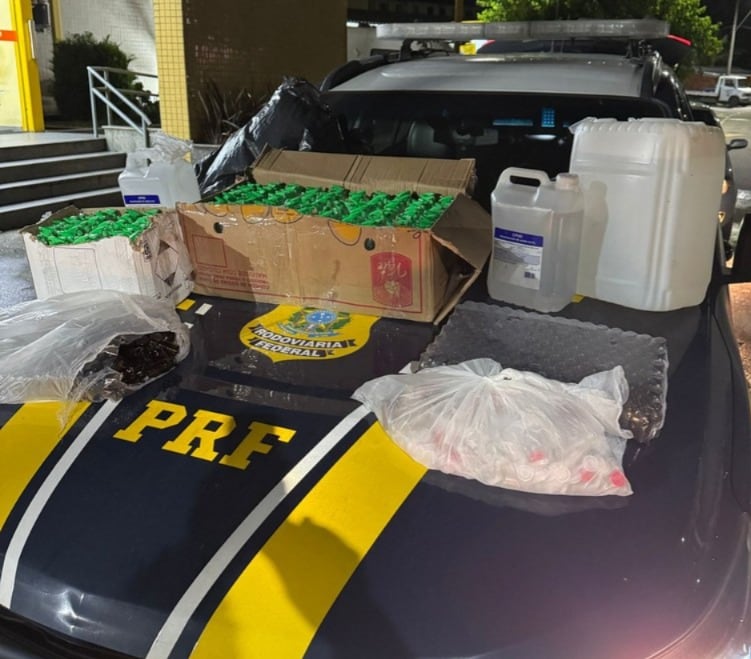 Após busca no veículo, a equipe localizou no porta-malas 260 frascos contendo cloreto de etila, popularmente conhecido como “lança-perfume”, prontos para uso e comercialização.