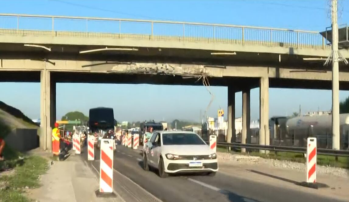 Placas de concreto caíram e parte superior do viaduto foi bloqueada; trânsito apresenta 7 km de engarrafamento