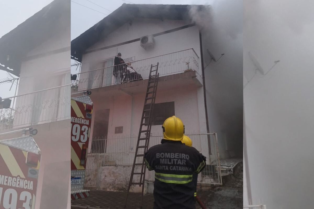Um casal de idosos foi resgatado pelo Corpo de Bombeiros em Rio Negrinho, no Norte de Santa Catarina, durante um incêndio em uma casa no bairro São Rafael, na manhã desta quinta-feira (3). O homem, de 82 anos, e a esposa, de 75, que é cadeirante, estavam presos na sacada do segundo andar da casa devido à intensa fumaça.
