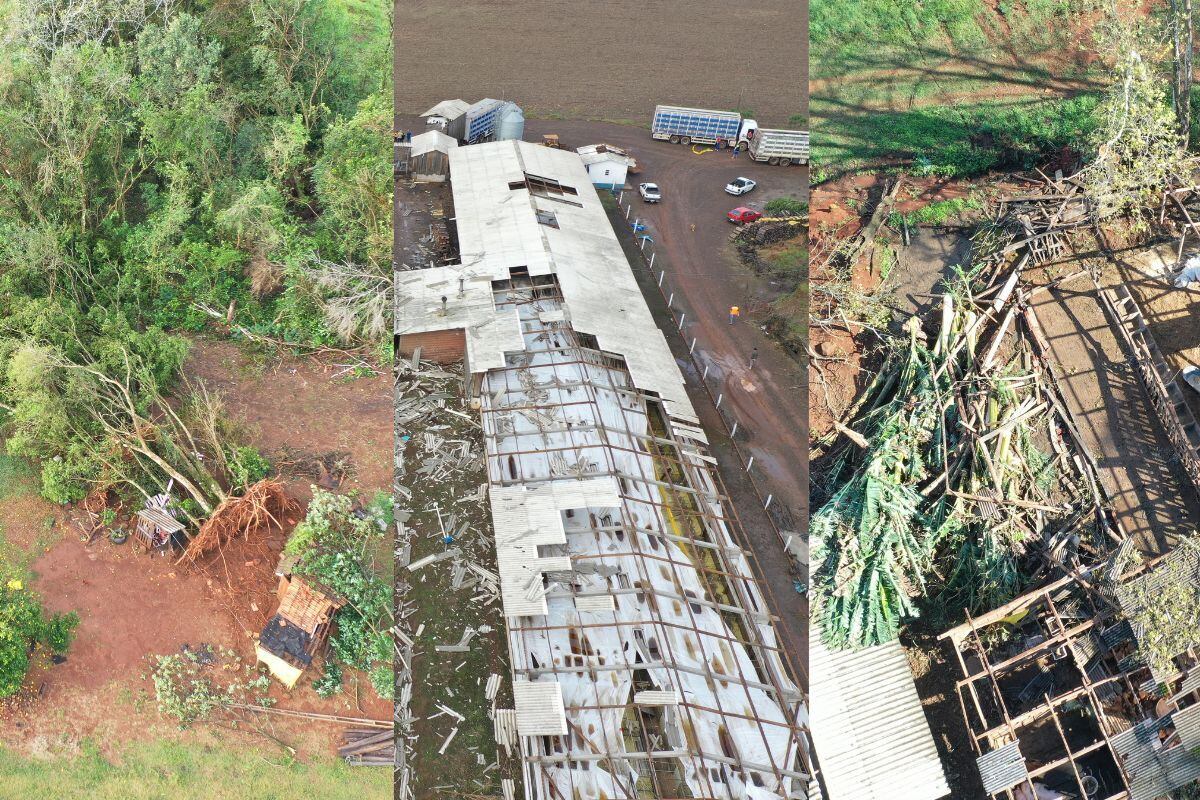 Imagens áreas divulgadas pela Prefeitura de Palmitos mostram o rastro de destruição deixado pelo tornado que atingiu o município na sexta-feira (9). O fenômeno causou danos em 50 residências, deixou 65 pessoas desalojadas e resultou na morte de um agricultor, que foi atingido por uma árvore.