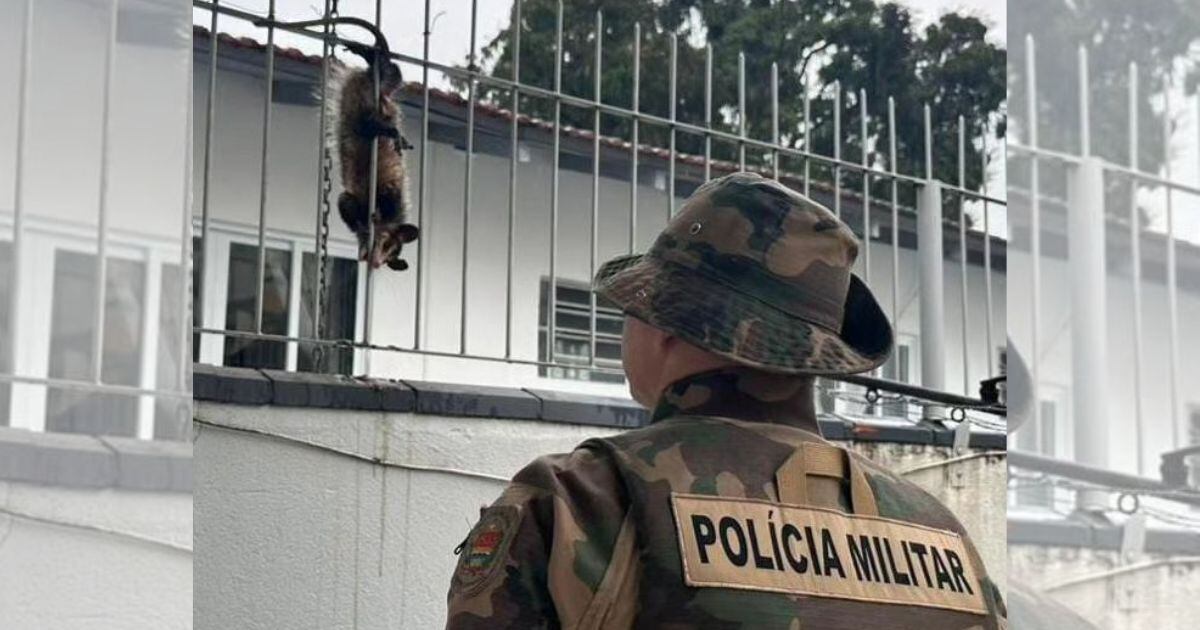 Um gambá ficou preso na grade de uma casa do bairro Anita Garibaldi, na zona Sul de Joinville. O animal, que carregava filhotes na bolsa marsupial, foi resgatado pela Polícia Militar Ambiental na tarde de terça-feira (29).