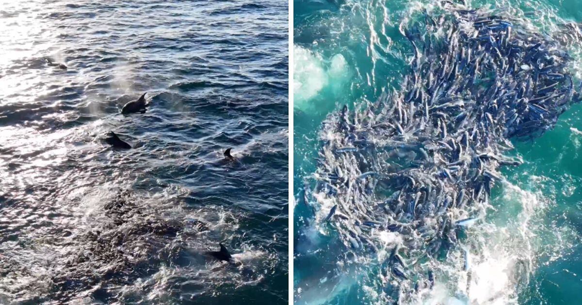 Cena com golfinhos e tainhas é filmada em ângulo raro; especialistas explicam fenômeno