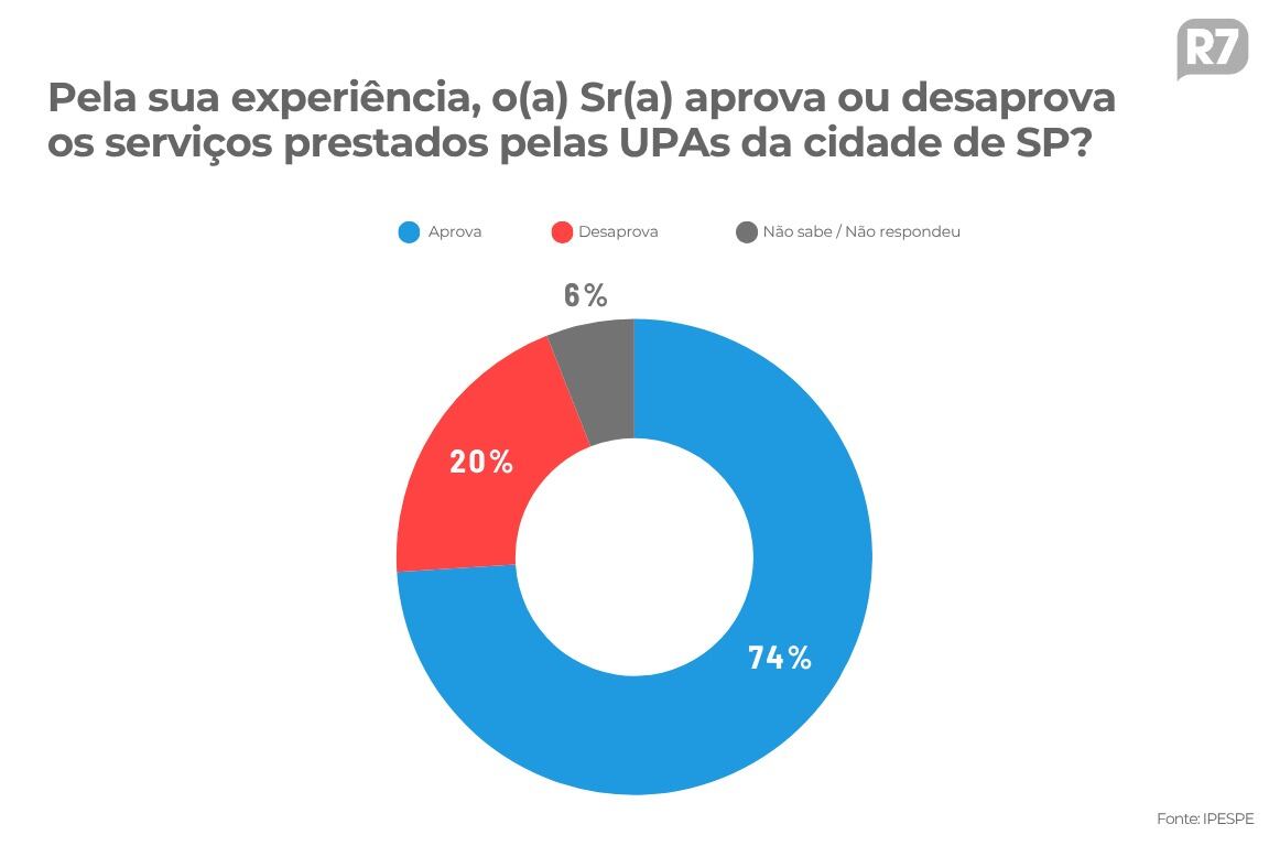 Em São Paulo, 74% dos usuários das UPAs (Unidade de Pronto Atendimento) aprovam os serviços prestados nas unidades da cidade, aponta uma pesquisa divulgada nesta quinta-feira (7) pelo Ipespe (Instituto de Pesquisas Sociais, Políticas e Econômicas). Dos que desaprovam, o índice é de 20%.