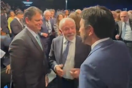 Após a cerimônia, o prefeito e o governador de São Paulo, Tarcísio de Freitas (Republicanos), aproximaram-se do presidente.
