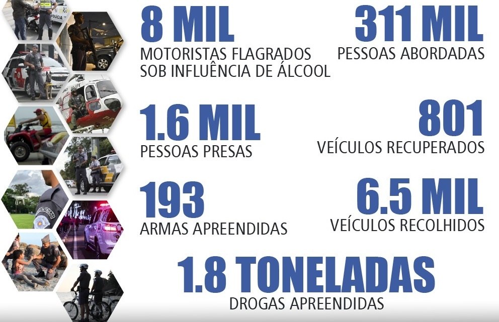 Além disto foram vistoriados 231.983 veículos, onde 801 carros roubados foram recuperados, além de 7.298 multas que foram aplicadas para motoristas que abordados dirigindo sob efeito de alcool, sendo que 120 deles foram presos.