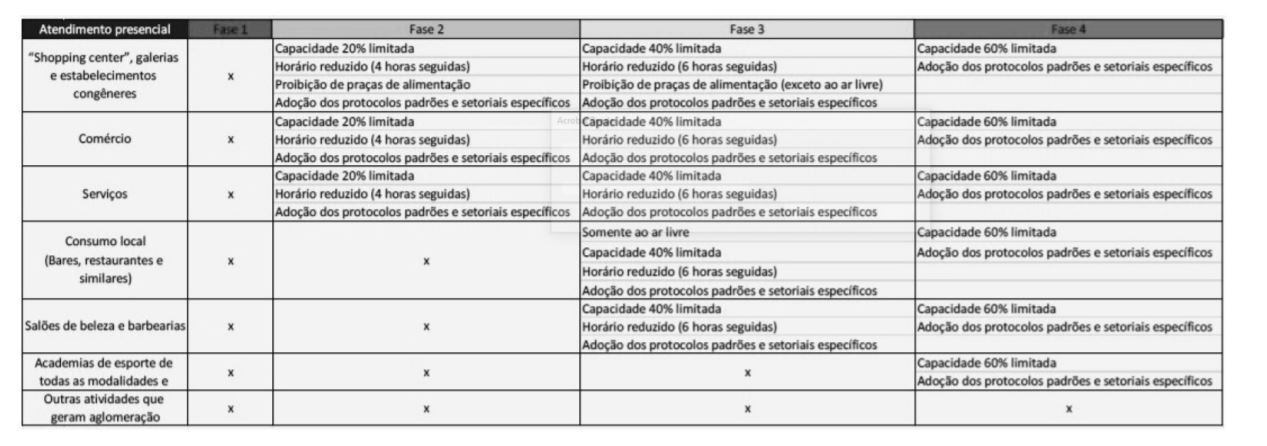 Todos os estabelecimentos terão de abrir com 20% da capacidade limitada, com horário de funcionamento reduzido e adotar os protocolos padrões e setoriais específicos. No caso dos shoppings, galerias e estabelecimentos congêneres, a abertura de praças de alimentação está proibida.