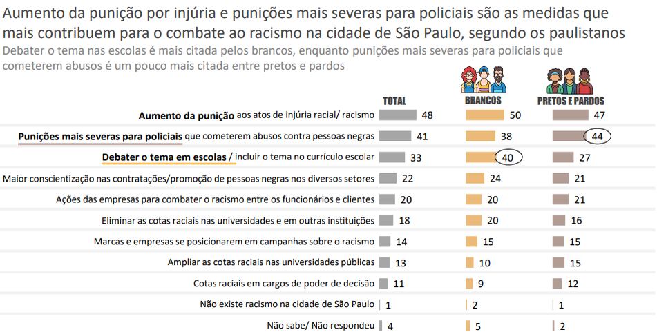 A respeito da punição aos abusos policiais contra negros, 44% dos pretos e pardos entrevistados e 38% dos brancos apontaram a medida como forma eficaz de combate ao racismo. Já a inclusão do tema no currículo escolar para fomentar debates nas escolas é citada muito mais pelos brancos (40%) ouvidos pelo estudo do que pelos negros (27%).