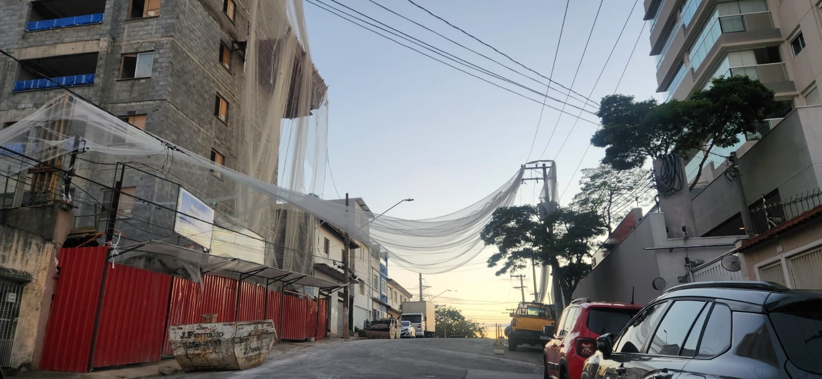 A tela de proteção de um prédio em construção se soltou, com os ventos de até 98 km/h que atingiram São Paulo, e caiu sobre a rede elétrica na rua Marquesa de Santos, Vila Dom Pedro I, no Ipiranga, na zona sul.