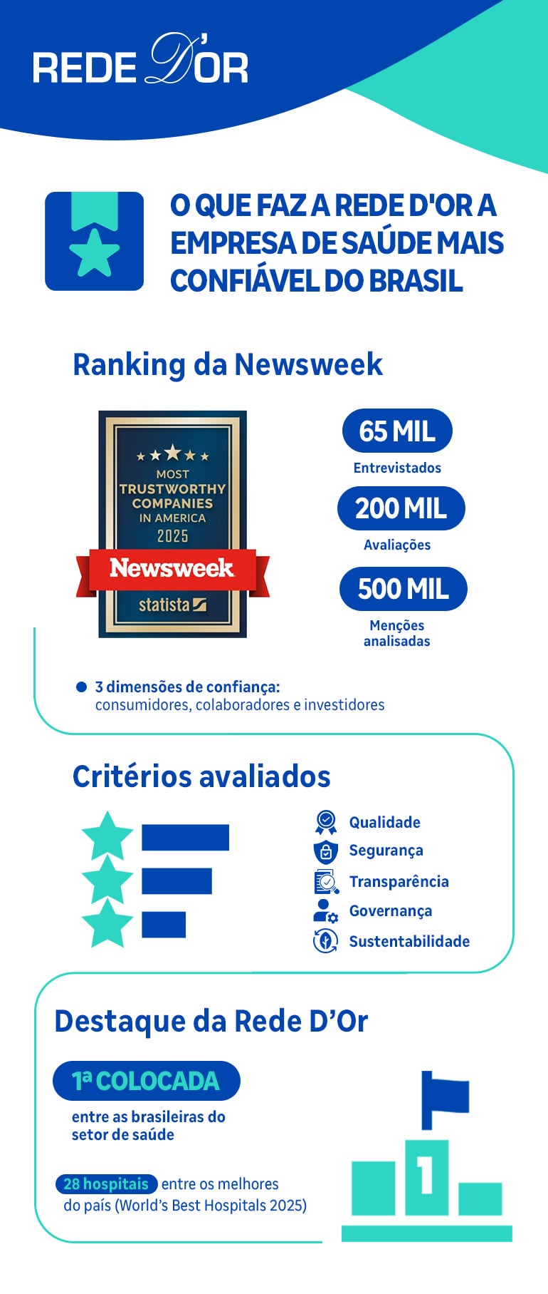 A Rede D’Or foi apontada como a empresa de saúde mais confiável do Brasil no ranking global World’s Most Trustworthy Companies 2025, da revista norte-americana Newsweek, que destaca as companhias mais respeitadas do mundo. Entre as brasileiras do setor “Health Care & Life Sciences”, a empresa aparece em primeiro lugar.