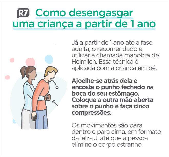 Já a partir de 1 ano até a fase adulta, o recomendado é utilizar a chamada manobra de Heimlich. Essa técnica é aplicada com a criança em pé. Ajoelhe-se atrás dela e encoste o punho fechado na boca do seu estômago. Coloque a outra mão aberta sobre o punho e faça cinco compressões. O movimento deve ter o formato da letra J. "Após a manobra, ela deve expelir o objeto ou vomitar. Quando o engasgo é parcial, você pode pedir primeiramente para a criança tossir, o que muitas vezes funciona", diz Célia.