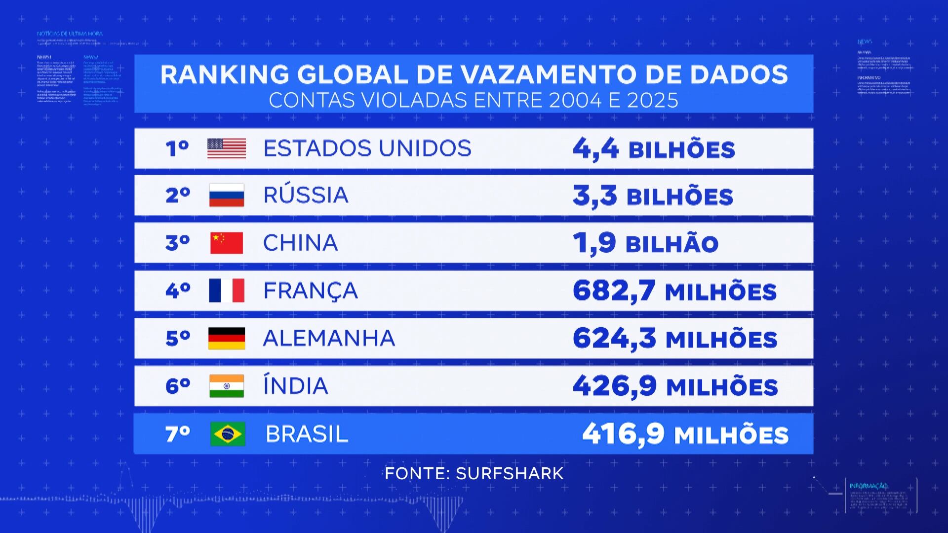 No ranking global feito pela companhia de segurança digital, o país ocupa a sétima posição com quase 416 milhões de contas violadas entre 2004 e 2025. Número está atrás apenas da Índia, Alemanha, França, China, Rússia e Estados Unidos, que lideram a lista com 4,4 bilhões de violações.