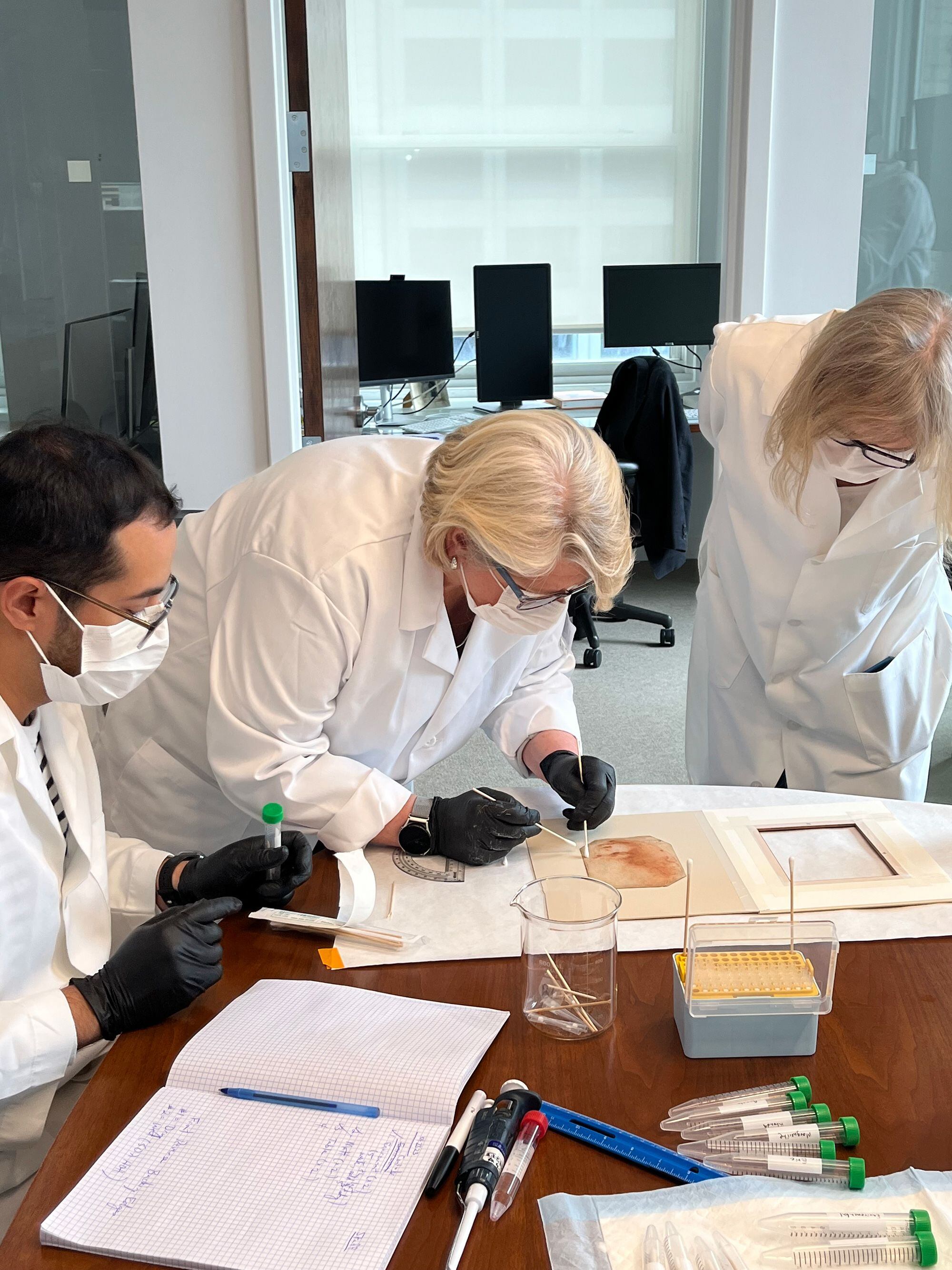 Após testar furos, cotonetes úmidos e secos, aspiração a seco e úmida e ferramentas usadas na área da ciência forense, a equipe de pesquisa determinou que a coleta com cotonete seco seria suficiente para obter uma amostra de DNA sem danificar a obra de arte.