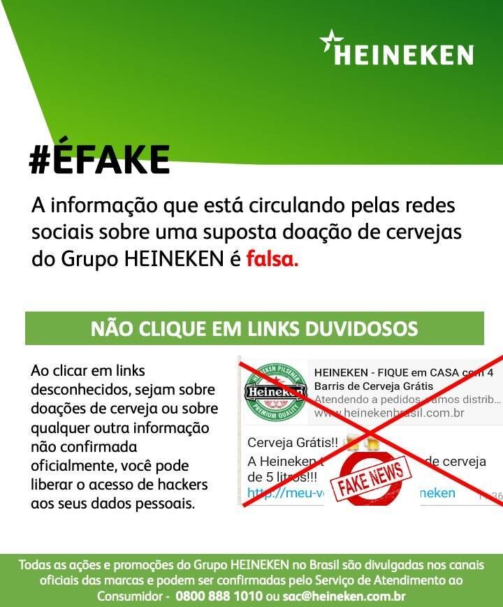 Procurada, a Heineken afirmou, em nota, que "é falsa a promoção que está circulando via WhatsApp nos últimos dias" e que "a recomendação da marca é não abrir o link em questão."